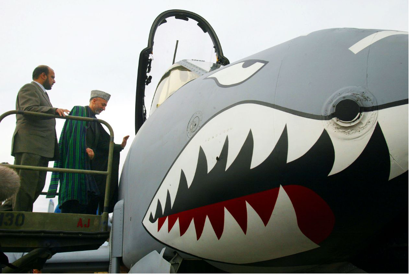 2002年,阿富汗領導人Mohammad Qasim Fahim和Hamid Karzai在阿富汗照參觀美國空軍A-10