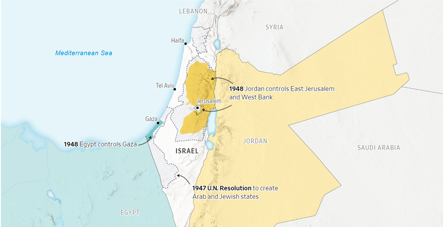 1947年,隨著第二次世界戰爭結束,猶太移民的增加伴隨著英國在該地區影響力的衰弱,聯合國決定建立一個猶太國家並從巴勒斯坦中獨立出來。這個以耶路撒冷為中心新成立的國家,便是「以色列」。隨著分治的鄰近,兩國衝突越演越烈,一年後以色列建國後,阿拉伯國家試圖入侵但反被聯合國驅趕,進入了加薩走廊和西岸的部分地區。具粗略統計,共有約70萬巴勒斯坦人流離失所。1949年簽署的停戰協議後來建立了非軍事化的綠線。