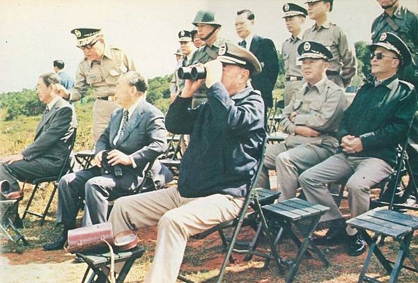 漢陽演習全軍參戰規模空前,總統親自實地視導。圖中前排左一為國防部長高魁元,站立說明者為陸軍總司令郝柏村,左二總統蔣經國、左三參謀總長宋長志,後排坐者右一為總政戰部主任王昇。(中國陸軍畫刊184期,民68年12月)