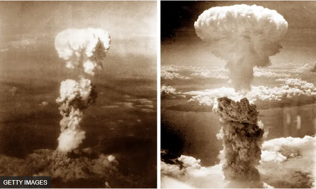 原子彈爆炸後升起的蘑菇雲,左圖為廣島,右圖為長崎。來源: https://www.bbc.com/zhongwen/trad/world-53713248