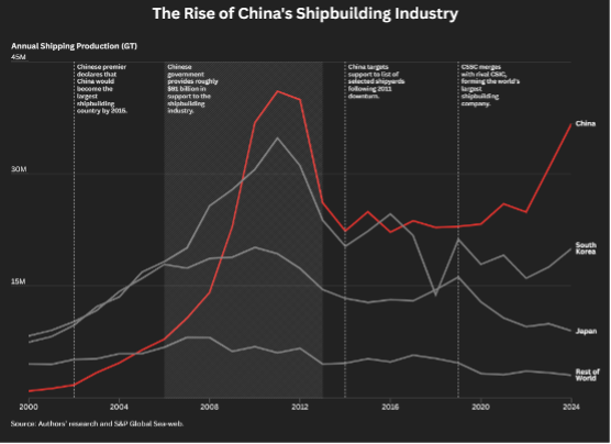 2019至2024年間,外國公司從中國購買了70%以上的船舶,其中許多交易與中國第一級(即直接為中國海軍建艦)船廠相關。尤其來自日本、韓國、希臘、丹麥與法國的航運企業,雖為美國的安全盟友,卻在市場機制驅動下選擇中國造船廠進行大量採購,無形中資助了中國軍工基礎建設的維運與升級。