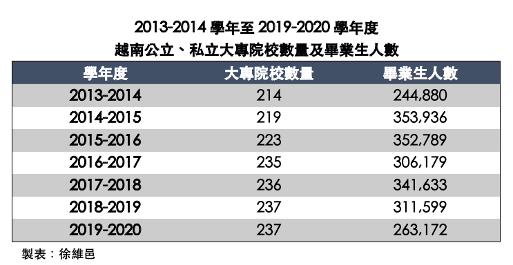 台灣正逢開學季,教育部8月26日公布新學年度大專院校預估新生入學人數為22.8萬人,實際上目前共有152間大專院校合計提供34.3萬的招生名額,足以容納所有從高職、高中畢業有意願進入大學的學生。高等教育普及化的時代,大幅增加的畢業生人數也改變了高教人力供給與就業市場需求的關係。近十年,台灣的大學畢業生失業率處於高於總體失業率的情況,不僅連年沒有好轉的跡象,即便順利就業,能夠找到的工作也存在許多低薪和無法讓其充分發揮所學的「低度就業」(underemployment)現象。同樣的結構性就業困境也正在越南發生當中。