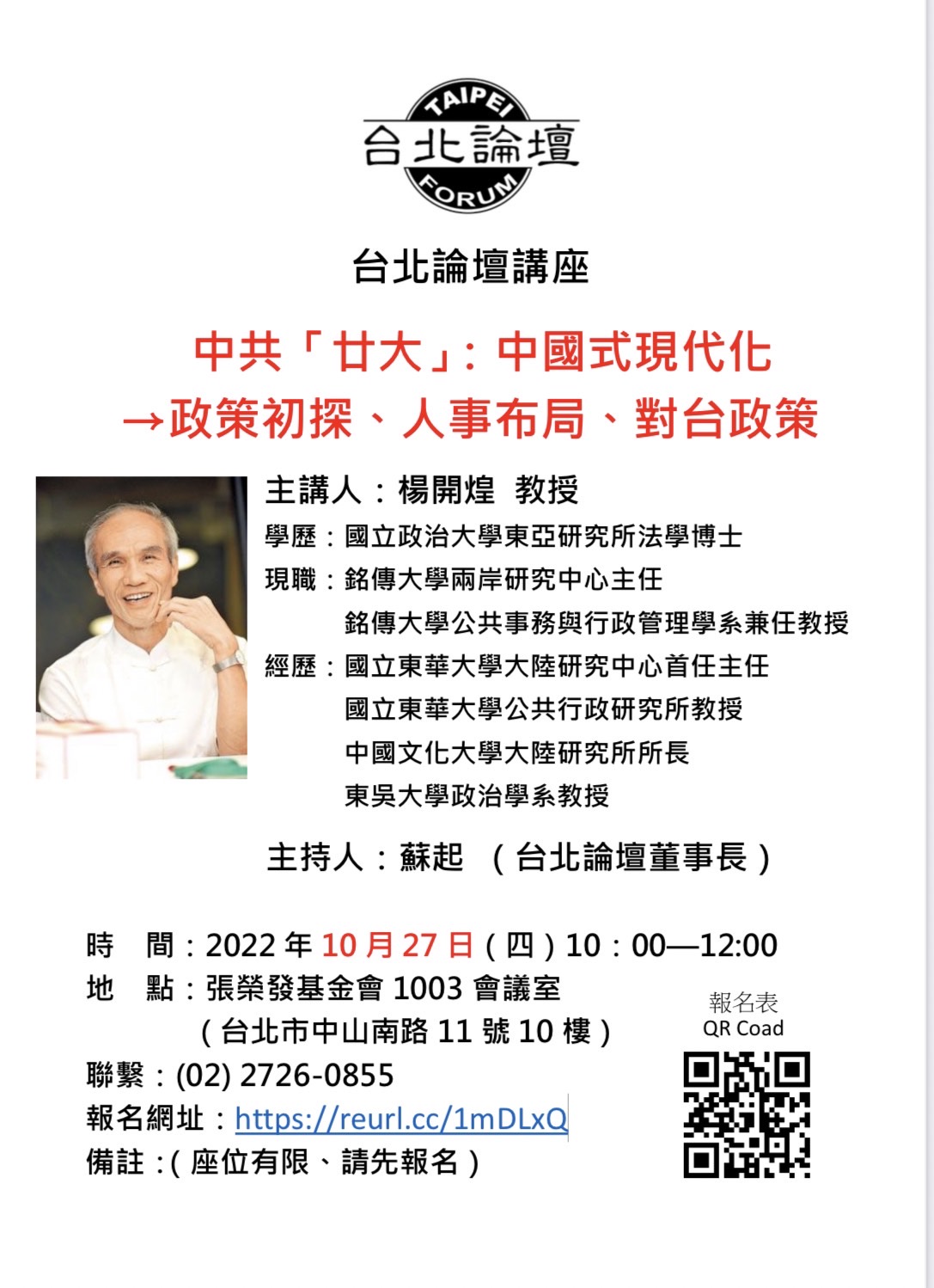 中共「廿大」:中國式現代化 →政策初探、人事布局、對台政策 主講人:楊開煌教