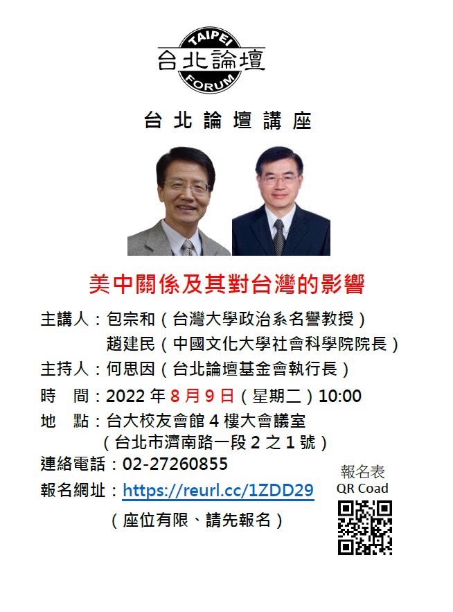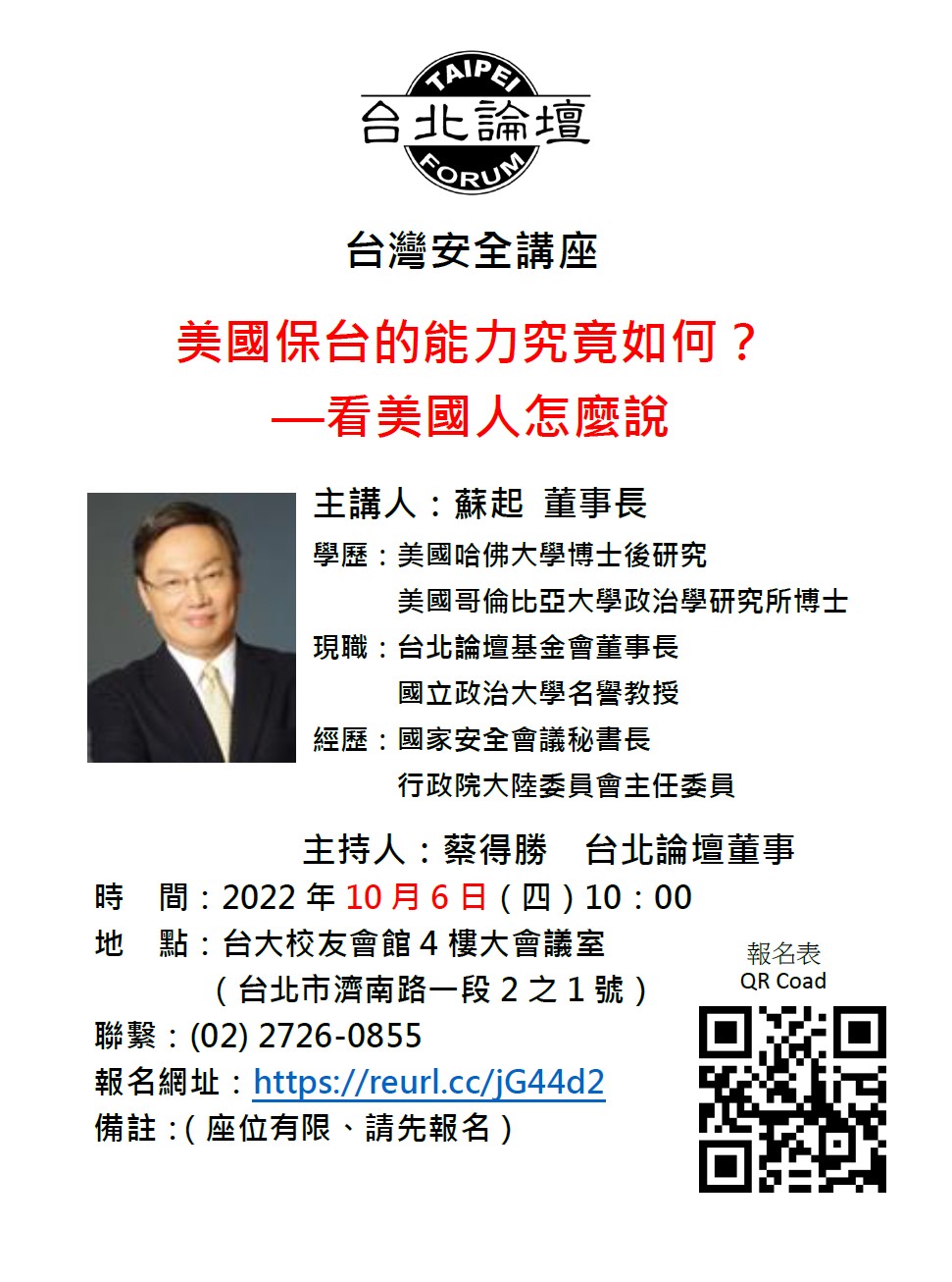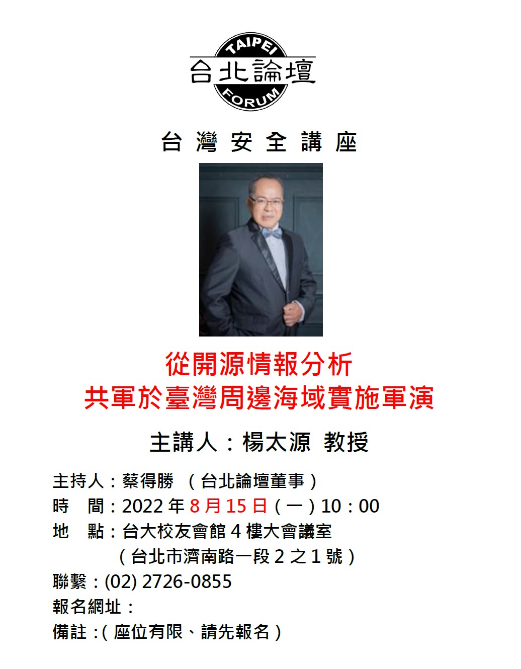 「台北論壇講座」將每月安排一至兩場與大師對談講座,解析當前台灣及全球國際情勢
