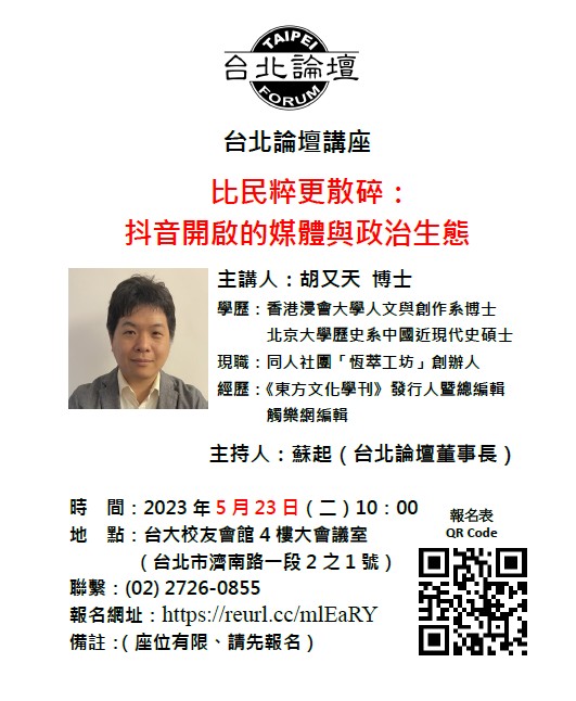 「抖音」自2016年發布以來,不僅迅速搶佔中國市場,其海外版「Tik Tok」於次年上線後,也以席捲之勢瘋迷世界各地,甚至引發包括美國在內的許多國家將其視為國安問題。抖音究竟有何魅力?它又對中國大陸乃至世界造成何種影響?台北論壇五月份〈台北論壇講座〉邀請到青年學者、同人社團「恆萃工坊」創辦人胡又天博士,以《比民粹更散碎:抖音開啟的媒體與政治生態》為題發表演說,帶您走進抖音的世界,深入了解這個廣受年輕人喜愛的短視頻應用程式的內涵。講座時間是5月23日(週二)上午10:00-12:00。地點在台大校友會館4樓大會議室(台北市濟南路一段 2 之 1 號)。歡迎各界報名參加。報名網址:https://reurl.cc/mlEaRY
