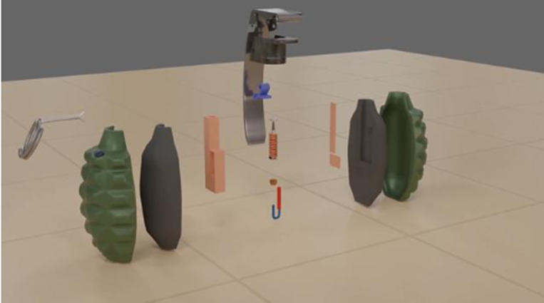 儘管手榴彈分為許多種,但其基本原理都是相同的。上圖,從左至右,手榴彈的構造依次為保險銷、彈體、高能炸藥、雷管、保險機構、擊針和引信。當手榴彈的保險插銷被拉開,並被擲出後,收緊的彈簧會開始復位,並帶動卡榫將保險握桿彈開,最後由於擊針碰撞底火點燃並引爆。