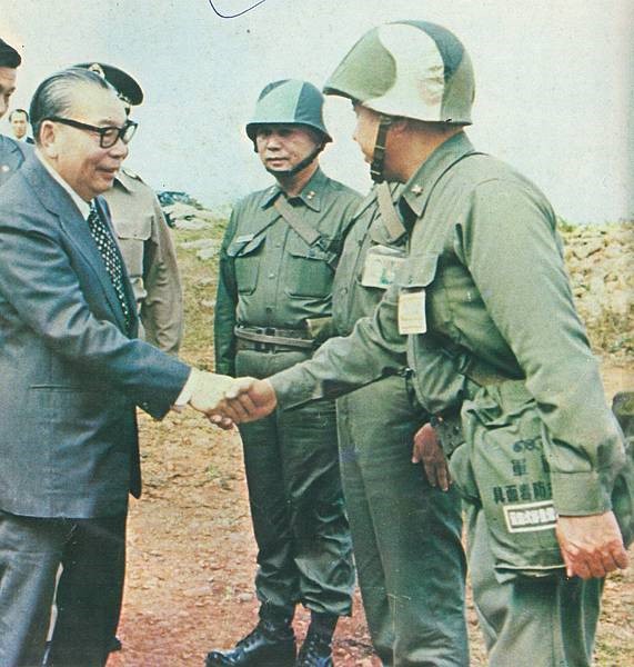 漢陽演習全軍參戰規模空前,總統親自實地視導。圖中前排左一為國防部長高魁元,站立說明者為陸軍總司令郝柏村,左二總統蔣經國、左三參謀總長宋長志,後排坐者右一為總政戰部主任王昇。(中國陸軍畫刊184期,民68年12月)