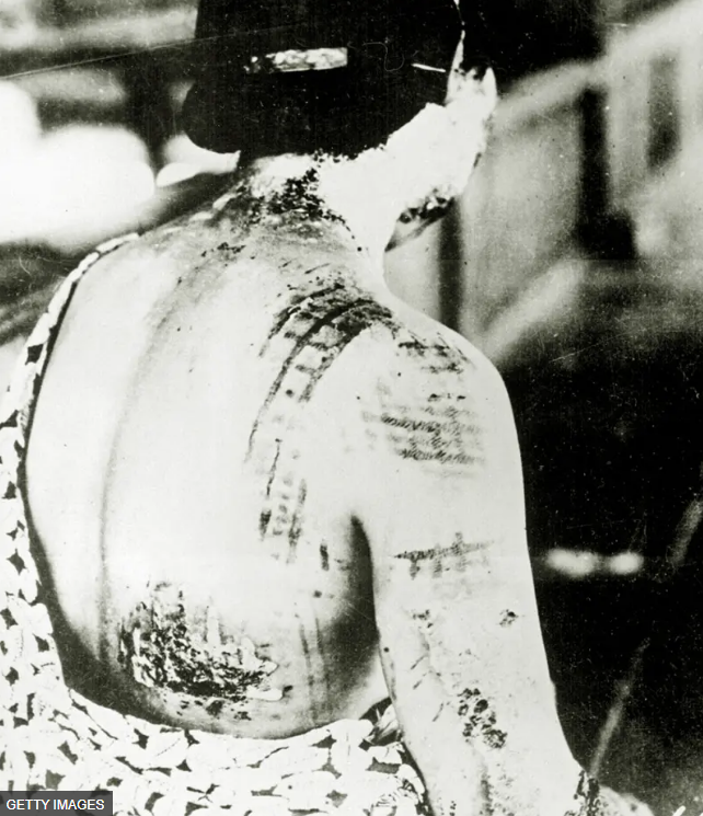 廣島一名女性在原子彈爆炸中受傷,她的皮膚被灼傷,留下的黑色痕跡與她在爆炸時穿的和服有關。來源: https://www.bbc.com/zhongwen/trad/world-53713248