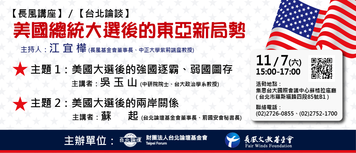 2020年的美國總統大選,是近百年來最對立、最混亂、最撲朔迷離的大選,無論選舉結果如何,都會對美國本身及世界各國帶來重大衝擊。尤其對東亞國家(包括中國大陸、台灣、日本、南韓等),美國總統將採取什麼政策及作法,更將影響各國未來的生存發展策略。有鑑於此一選舉的重要性,長風基金會與台北論壇基金會特別邀請中研院吳玉山院士與前國安會祕書長蘇起教授,深入分析美國總統大選結果對東亞局勢及兩岸關係的影響。兩位重量級學者專家的演講精彩可期,歡迎大家踴躍報名參加。