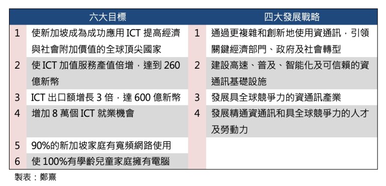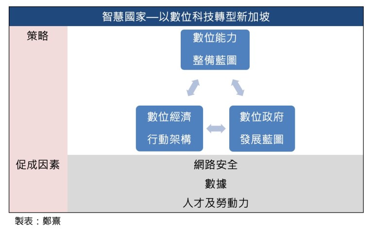 新加坡政府基於「服務4.0」的概念,提出了「數位經濟行動架構」(The Digital Economy Framework for Action),目標是使星國成為世界領先數位經濟體,其三項重點戰略為:(一)加速現有產業數位化,以提高生產力、效率和創造新的收入機會;(二)以客戶需求為中心,培育新的綜合生態系統,增强經濟競爭力;(三)發展下一代數位產業,使之成為經濟成長的引擎,成為所有產業數位化的驅動力。目前新加坡積極發展的四大科技新領域,分別為數據科學與人工智慧(AI)、網路安全、沉浸式媒體及物聯網(IOT)和未來通訊基礎設施。