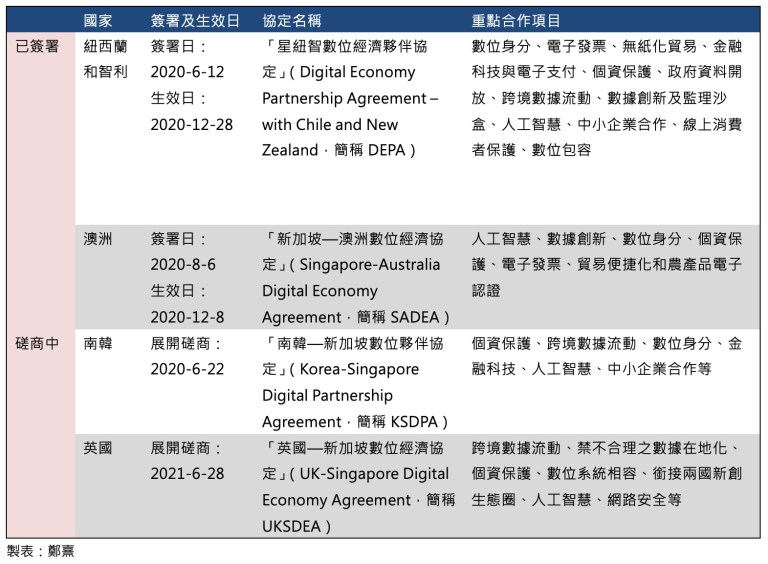 如表一所示,新加坡已分別在2020年6月與紐西蘭和智利、8月與澳洲簽訂數位經濟協定,也已與南韓及英國就類似協定展開磋商,更計劃於本年度推動美星數位經濟協定。新加坡如此積極擴大數位貿易網絡,對外有助於穩固星國數位樞紐的地位,吸引更多投資與專業人才,對內更能進一步加速資通訊科技(ICT)產業上的發展,朝「智慧國家」(smart nation)邁進。新加坡預計在今年投資38億元新幣(約新台幣784億)進行ICT採購,比上個財政年度增近一成;另外將投入250億新幣(約新台幣5,159億元)於「研究、創新與企業2025計畫」(RIE2025),是1991年推行5年科技研發投資計畫以來最大一筆撥款,足見星國對數位科技發展的重視。