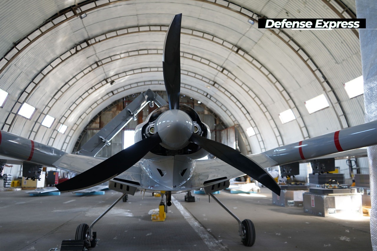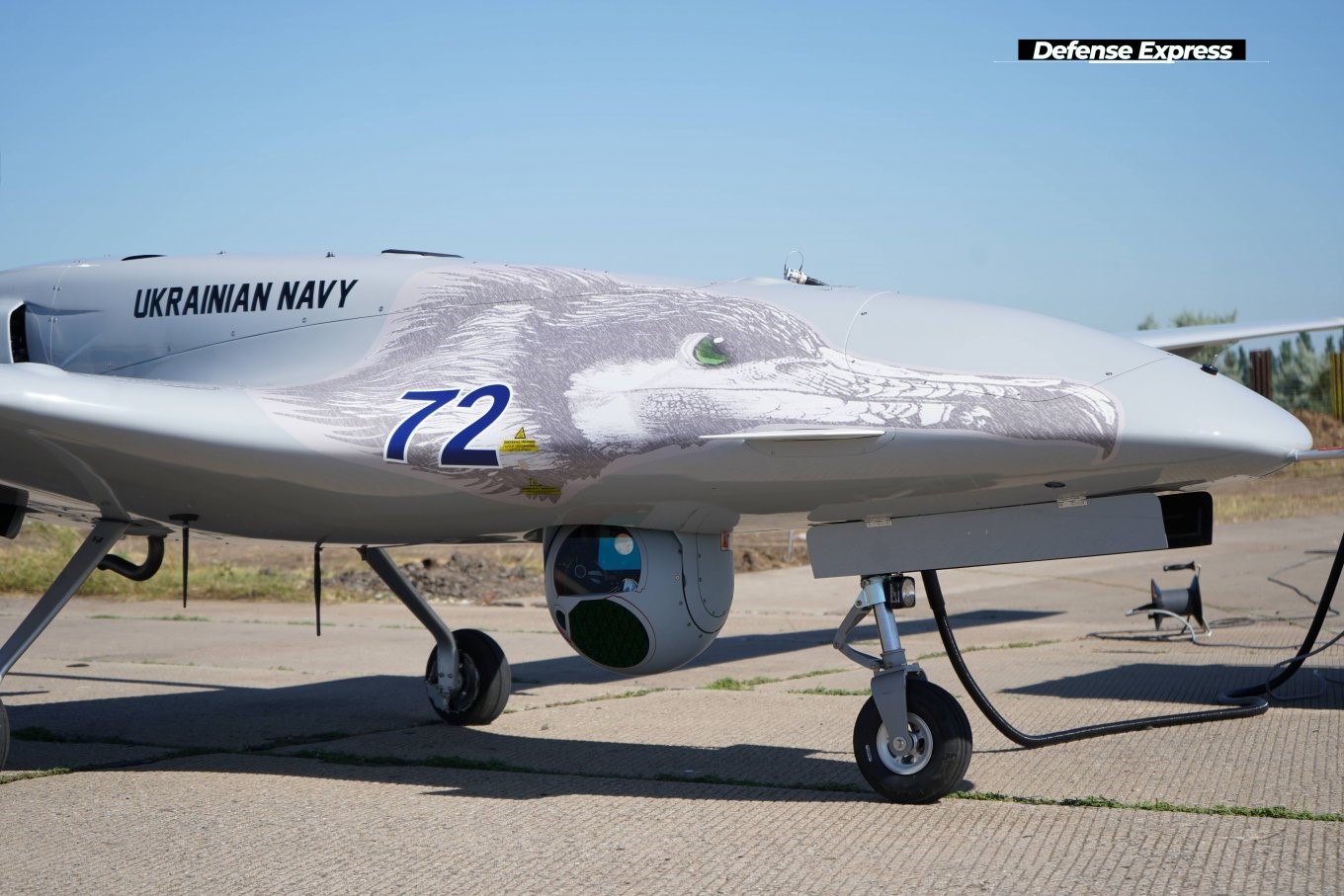 圖為海軍TB2,機身帶有鸕鶿塗裝及UKRAINIAN NAVY(烏克蘭海軍)的字樣。感測器為L3Harris製的WESCAM MX-15D,該感測器因2020年納卡戰爭緣故遭加拿大禁止出口;現已改使用土耳其Aselsan製CATS(Common Aperture Targeting System, CATS)感測器。
